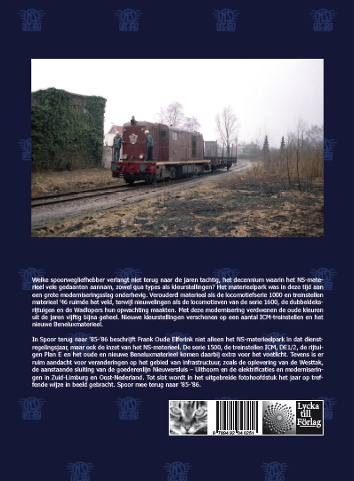 In Spoor terug naar '85-'86 beschrijft Frank Oude Elferink niet alleen het NS-materieelpark in dat dienstregelingsjaar, maar ook de inzet van het NS-materieel. De serie 1500, de treinstellen ICM, DE1/2, de rijtuigen Plan E en het oude en nieuwe Beneluxmaterieel komen daarbij extra voor het voetlicht. Tevens is er ruim aandacht voor veranderingen op het gebied van infrastructuur, zoals de oplevering van de Westtak, de aanstaande sluiting van de goederenlijn Nieuwersluis - Uithoorn en de elektrificaties en moderniseringen in Zuid-Limburg en Oost-Nederland. Tot slot wordt in het uitgebreide fotohoofdstuk het jaar op treffende wijze in beeld gebracht. Spoor mee terug naar '85-'86.