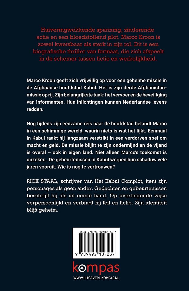 Nog tijdens zijn eenzame reis naar de hoofdstad belandt Marco in een schimmige wereld, waarin niets is wat het lijkt. Eenmaal in Kabul raakt hij langzaam verstrikt in een verdorven spel om macht en geld. De missie blijkt te zijn ondermijnd en de vijand is overal – ook in eigen land. Niet alleen Marco’s toekomst is onzeker… De gebeurtenissen in Kabul werpen hun schaduw vele jaren vooruit. Wie is nog te vertrouwen?