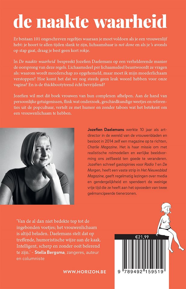 Er bestaan 101 ongeschreven regels waar je aan moet voldoen als je een vrouw bent: je hoort ten alle tijden slank te zijn, lichaamshaar is not done en als je 's avonds op stap gaat, draag je best geen kort rokje. In De naakte waarheid bespreekt Jozefien op een verhelderende manier de oorsprong van deze regels. Aan de hand van persoonlijke getuigenissen, flink wat onderzoek, geschiedkundige weetjes en vooral veel referenties uit de popcultuur, vertelt ze met veel humor en zelfrelativering en zonder taboes wat het betekent om een vrouwenlichaam te hebben.