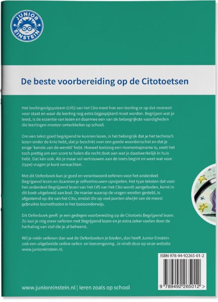 Met deze Oefenboeken kun je goed en verantwoord oefenen voor het onderdeel Begrijpend lezen en daarmee je zelfvertrouwen opvijzelen. Het type teksten dat voor het onderdeel Begrijpend lezen van het LVS van het Cito wordt aangeboden, komt in dit boek uitgebreid aan bod. De manier waarop de vragen worden gesteld, is afgestemd op die van het Cito, omdat die op veel punten afwijkt van de meest gebruikte lesmethoden in het basisonderwijs.