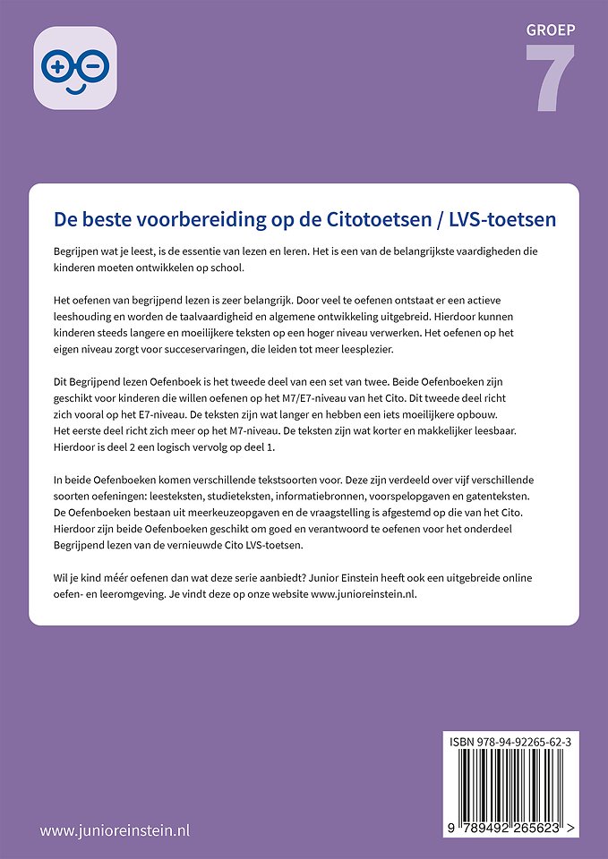 Dit Begrijpend lezen Oefenboek is het tweede deel van een set van twee. Beide Oefenboeken zijn geschikt voor kinderen die willen oefenen op het M7/E7-niveau van het Cito. Dit tweede deel richt zich vooral op het E7-niveau. De teksten zijn wat langer en hebben een iets moeilijkere opbouw. Het eerste deel richt zich meer op het M7-niveau. De teksten zijn wat korter en makkelijker leesbaar. Hierdoor is deel 2 een logisch vervolg op deel 1.