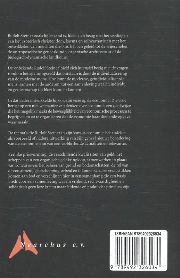 De thema's die Rudolf Steiner in zijn 'cursus economie' behandelde als voorbeeld of nadere uitwerking van zijn geheel nieuwe benadering van de economie, zijn van een verbluffende actualiteit en relevantie. Eerlijke prijsvorming, de verschillende kwaliteiten van geld, het scheppen van een organische geldkringloop, samenwerken in plaats van concurreren, het beheer van grond en bodemschatten, de rol van de consument, geldschepping, arbeid en inkomen: al deze vraagstukken komen aan bod en verschijnen hier in een samenhang die een basis biedt voor een samenleving waarin vrijheid, rechtvaardigheid en solidariteit geen loze kreten maar leidende en praktische principes zijn.