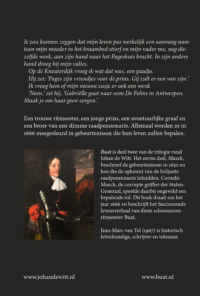 vertelt Jean-Marc van Tol in dit tweede deel van de Johan de Witt-trilogie het meeslepende levensverhaal van Henri de Fleury de Culan, beter bekend als ritmeester Buat. Aan de hand van memoires, getuigenissen, lofdichten en andere documenten komt een bijzonder boeiende periode uit de vaderlandse geschiedenis tot leven.