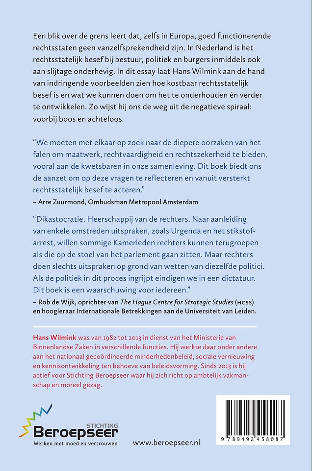 Een blik over de grens leert dat, zelfs in Europa, goed functionerende rechtsstaten geen vanzelfsprekendheid zijn. In Nederland is het rechtsstatelijk besef bij bestuur, politiek en burgers inmiddels ook aan slijtage onderhevig. In dit essay laat Hans Wilmink aan de hand van indringende voorbeelden zien hoe kostbaar rechtsstatelijk besef is en wat we kunnen doen om het te onderhouden én verder te ontwikkelen. Zo wijst hij ons de weg uit de negatieve spiraal: voorbij boos en achteloos.