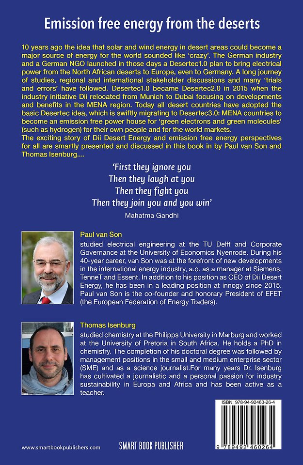 The exciting story of Dii Desert Energy and emission free energy perspectives for all are smartly presented and discussed in this book in by Paul van Son and Thomas Isenburg....