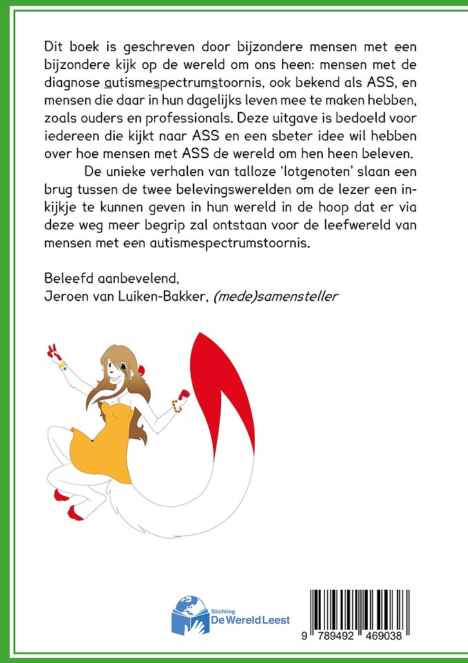 Dit boek is geschreven door bijzondere mensen met een bijzondere kijk op de wereld om ons heen. Deze bijzondere kijk op de wereld is afkomstig van mensen met een diagnose 'Autisme Spectrum Stoornis', ook bekend als ASS, of mensen die daar in hun dagelijks leven mee te maken hebben zoals ouders en professionals. Deze uitgave is bedoeld voor iedereen die kijkt naar ASS en een beter idee wil hebben over hoe mensen met ASS de wereld om hen heen beleven.