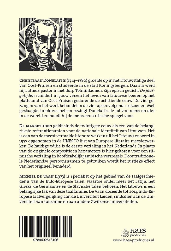 Christiaan Donelaitis (1714–1780) groeide op in het Litouwstalige deel van Oost-Pruisen en studeerde in de stad Koningsbergen. Daarna werd hij Luthers pastor in het dorp Tolminkemen. Zijn episch gedicht De jaargetijden schildert in 3000 verzen het leven van Litouwse boeren op het platteland van Oost-Pruisen gedurende de achttiende eeuw. De vier gezangen van het werk behandelen de vier opeenvolgende seizoenen. Met geslaagde karakterschetsen bezingt Donelaitis de rol van mens en dier in de wereld en houdt hij de mens een kritische spiegel voor.