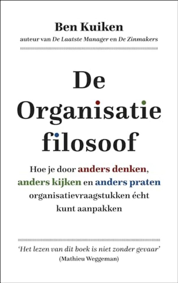 In dit boek laat organisatiefilosoof Ben Kuiken zien hoe je ook anders naar organisatieproblemen kunt kijken. Je krijgt het filosofische gereedschap aangereikt om anders te kijken, te denken en te praten over de organisatie en de vraagstukken die daar keer op keer hun kop opsteken. Welke aannames gaan erachter schuil? En wat levert het je op als je een ander perspectief kiest?