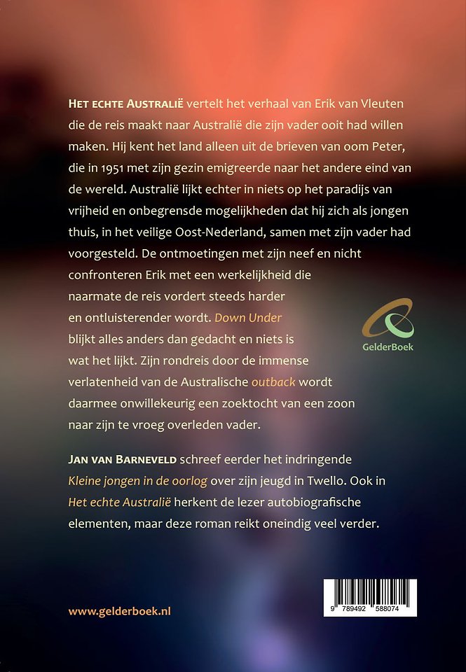 'Het echte Australië' vertelt het verhaal van Erik van Vleuten die de reis maakt naar Australië die zijn vader ooit had willen maken. Hij kent het land alleen uit de brieven van oom Peter, die in 1951 met zijn gezin emigreerde naar het andere eind van de wereld. Australië lijkt echter in niets op het paradijs van vrijheid en onbegrensde mogelijkheden dat hij zich als jongen thuis, in het veilige Oost-Nederland, samen met zijn vader had voorgesteld. De ontmoetingen met zijn neef en nicht confronteren Erik met een werkelijkheid die naarmate de reis vordert steeds harder en ontluisterender wordt. Down Under blijkt alles anders dan gedacht en niets is wat het lijkt. Zijn rondreis door de immense verlatenheid van de Australische outback wordt daarmee onwillekeurig een zoektocht van een zoon naar zijn te vroeg overleden vader. --- Jan van Barneveld schreef eerder het indringende 'Kleine jongen in de oorlog' over zijn jeugd in Twello. Ook in 'Het echte Australië' herkent de lezer autobiografische elementen, maar deze roman reikt oneindig veel verder.