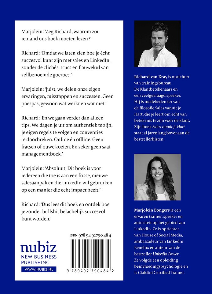 In dit boek combineren Richard van Kray en Marjolein Bongers hun expertise op het gebied van sales en LinkedIn tot een unieke gids waarmee je de effectiviteit van je salesaanpak flink zult verbeteren. Offline in een salesgesprek én online op LinkedIn. Die werelden vloeien steeds meer samen, dus het is verstandig om geen kant te kiezen, maar het één te doen en het ander niet te laten. Richard en Marjolein laten zien hoe je écht succesvol kunt zijn, zonder de clichés en fratsen van zelfbenoemde goeroes. Dat gaat verder dan alleen tips – ze dagen je uit om authentiek te zijn en je eigen regels te volgen. Want succesvol zijn kan alleen als je naar binnen durft te keren, jezelf laat zien, echte verbinding aangaat en niet bang bent om fouten te maken.