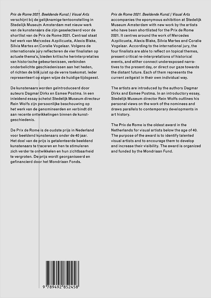 Prix de Rome 2021. Beeldende Kunst / Visual Arts verschijnt bij de gelijknamige tentoonstelling in Stedelijk Museum Amsterdam met nieuw werk van de kunstenaars die zijn geselecteerd voor de shortlist van de Prix de Rome 2021. Centraal staat het werk van Mercedes Azpilicueta, Alexis Blake, Silvia Martes en Coralie Vogelaar. Volgens de internationale jury reflecteren de vier finalisten op actuele thema’s, bieden kritische herinterpretaties van historische gebeurtenissen, verbinden onderbelichte geschiedenissen aan het heden, of richten de blik juist op de verre toekomst. Ieder representeert op eigen wijze de huidige tijdsgeest.