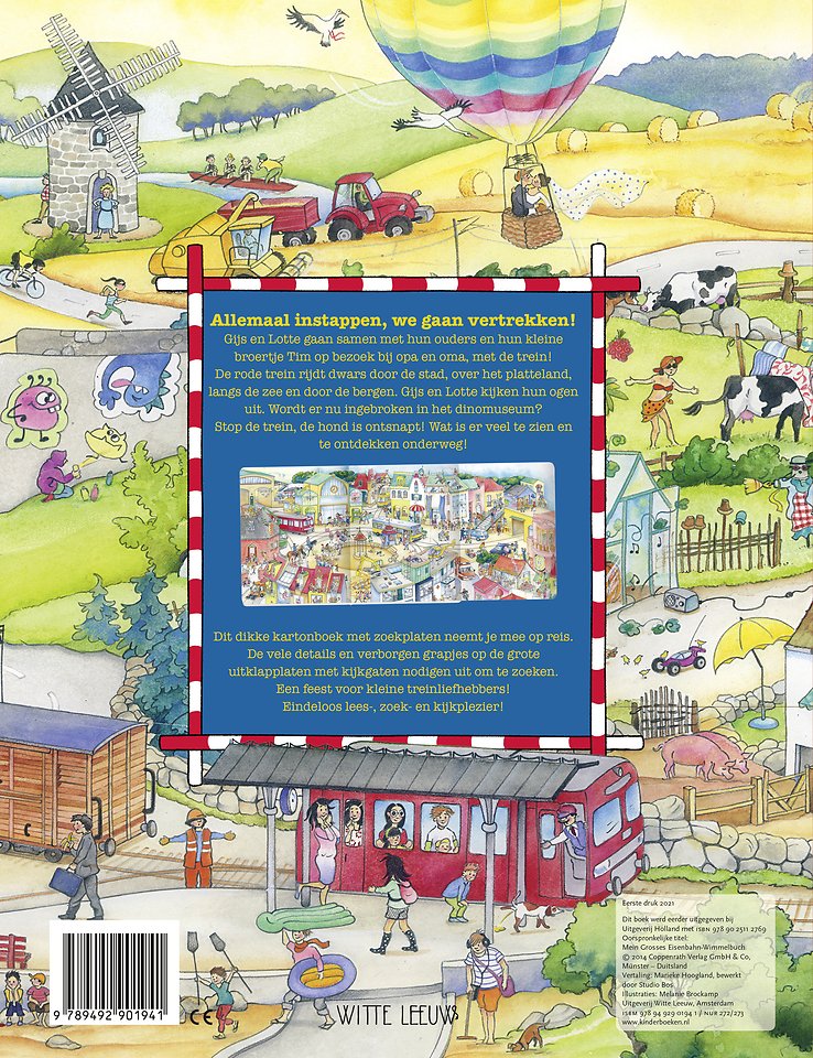 Allemaal instappen, we gaan vertrekken! Gijs en Lotte gaan samen met hun ouders en hun kleine broertje Tim op bezoek bij opa en oma, met de trein! De rode trein rijdt dwars door de stad, over het platteland, langs de zee en door de bergen. Gijs en Lotte kijken hun ogen uit. Wordt er nu ingebroken in het dinomuseum? Stop de trein, de hond is ontsnapt! Wat is er veel te zien en te ontdekken onderweg! Dit dikke kartonboek met zoekplaten neemt je mee op reis. De vele details en verborgen grapjes op de grote uitklapplaten met kijkgaten nodigen uit om te zoeken. Een feest voor kleine treinliefhebbers! Lees ook: Waar is de gele graafmachine?