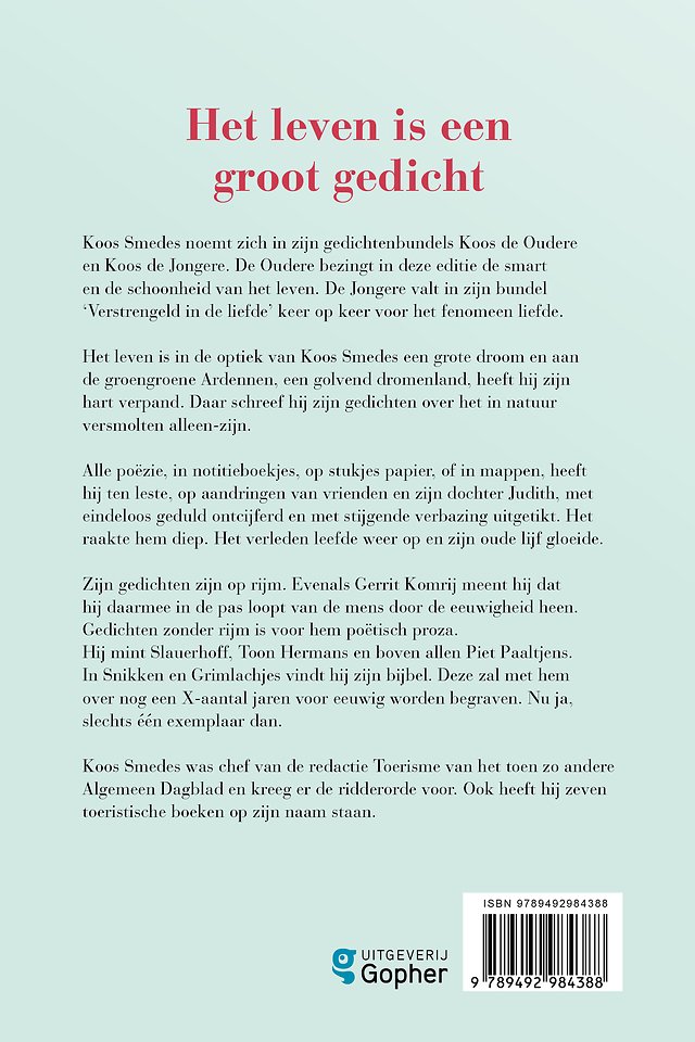 Koos Smedes noemt zich in zijn gedichtenbundels Koos de Oudere en Koos de Jongere. De Oudere bezingt in deze editie de smart en de schoonheid van het leven. De Jongere valt in zijn bundel ‘Verstrengeld in de liefde’ keer op keer voor het fenomeen liefde.