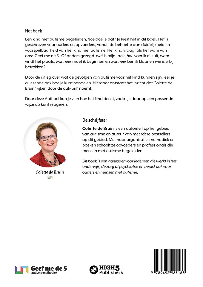 Geef me de 5 is geschreven naar ouders en opvoeders toe. Een kind met autisme begeleiden, Hoe doe je dat? Daar gaat dit boek over. Het is geschreven vanuit de behoefte aan duidelijkheid en voorspelbaarheid die het kind met autisme nodig heeft. Het kind vraagt als het ware van ons: ‘Geef me de 5.’ Of anders gezegd: Wat is mijn taak, Hoe voer ik het uit, Waar vindt het plaats, Wanneer moet ik beginnen en Wanneer ben ik klaar, en Wie is erbij betrokken? Doordat er uitleg wordt gegeven over wat de gevolgen van autisme voor het kind kunnen zijn, leert men al lezende ook de bijbehorende wijze van handelen hanteren. Hierdoor ontstaat het inzicht wat de schrijfster noemt: ‘de Auti-bril opzetten’. Door deze Auti-bril kun je zien Hoe het kind denkt, zodat je daar op een passende wijze op kunt reageren.