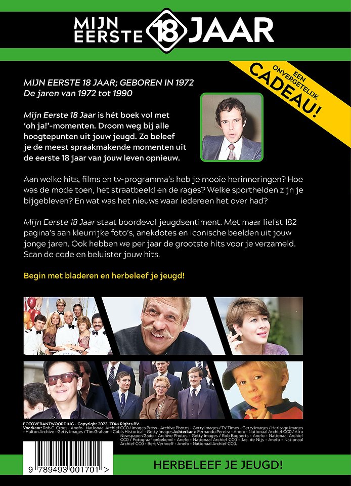 Mijn Eerste 18 Jaar staat boordevol jeugdsentiment. Met maar liefst 182 pagina’s aan kleurrijke foto’s, anekdotes en iconische beelden uit jouw jonge jaren. Ook hebben we per jaar de grootste hits voor je verzameld. Scan de code en beluister jouw hits.