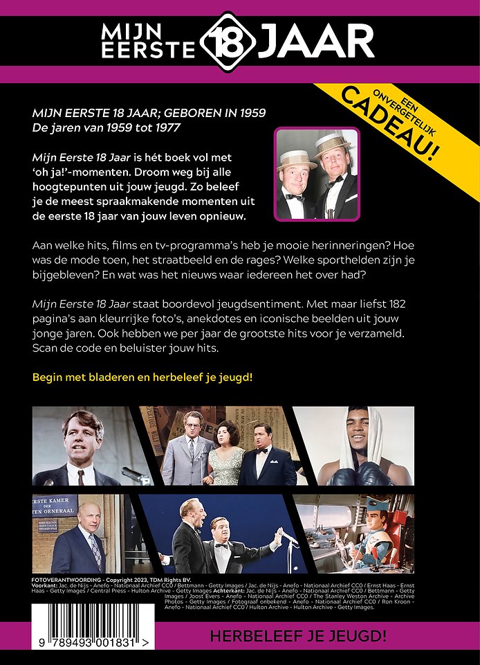Mijn Eerste 18 Jaar staat boordevol jeugdsentiment. Met maar liefst 182 pagina’s aan kleurrijke foto’s, anekdotes en iconische beelden uit jouw jonge jaren. Ook hebben we per jaar de grootste hits voor je verzameld. Scan de code en beluister jouw hits.