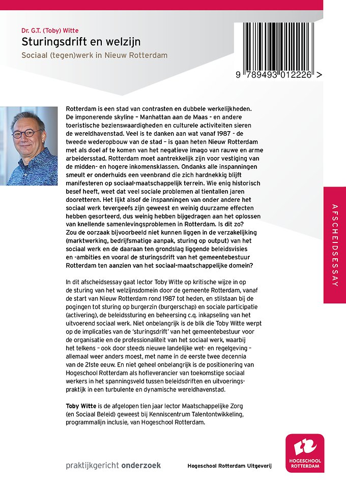In dit afscheidsessay gaat lector Toby Witte op kritische wijze in op de sturing van het welzijnsdomein door de gemeente Rotterdam, vanaf de start van Nieuw Rotterdam rond 1987 tot heden, en stilstaan bij de pogingen tot sturing op burgerzin (burgerschap) en sociale participatie (activering), de beleidssturing en beheersing c.q. inkapseling van het uitvoerend sociaal werk. Niet onbelangrijk is de blik die Toby Witte werpt op de implicaties van de ‘sturingsdrift’ van het gemeentebestuur voor de organisatie en de professionaliteit van het sociaal werk, waarbij het telkens – ook door steeds nieuwe landelijke wet- en regelgeving – allemaal weer anders moest, met name in de eerste twee decennia van de 21ste eeuw. En niet geheel onbelangrijk is de positionering van Hogeschool Rotterdam als hofleverancier van toekomstige sociaal werkers in het spanningsveld tussen beleidsdriften en uitvoeringspraktijk in een turbulente en dynamische wereldhavenstad.