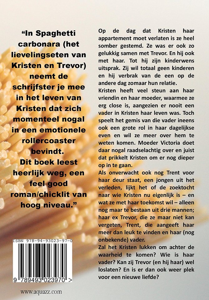 “In Spaghetti carbonara (het lievelingseten van Kristen en Trevor) neemt de schrijfster je mee in het leven van Kristen dat zich momenteel nogal in een emotionele rollercoaster bevindt. Dit boek leest heerlijk weg, een feel good roman/chicklit van hoog niveau.”