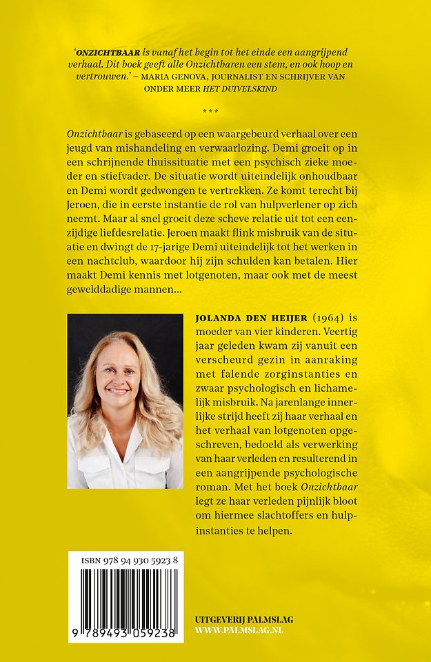 Jolanda den Heijer (1964) is moeder van vier kinderen. Veertig jaar geleden kwam zij vanuit een verscheurd gezin in aanraking met falende zorginstanties en zwaar psychologisch en lichamelijk misbruik. Na jarenlange innerlijke strijd heeft zij haar verhaal en het verhaal van lotgenoten opgeschreven, bedoeld als verwerking van haar verleden en resulterend in een aangrijpende psychologische roman. Met het boek 'Onzichtbaar' legt ze haar verleden pijnlijk bloot om hiermee slachtoffers en hulpinstanties te helpen.
