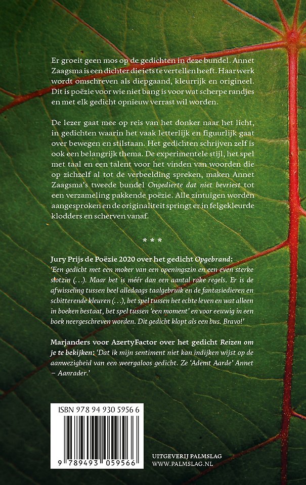 Er groeit geen mos op de gedichten in deze bundel. Annet Zaagsma is een dichter die iets te vertellen heeft. Haar werk wordt omschreven als diepgaand, kleurrijk en origineel. Dit is poëzie voor wie niet bang is voor wat scherpe randjes en met elk gedicht opnieuw verrast wil worden.