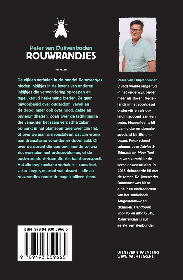 Peter van Duijvenboden (1962) werkte lange tijd in het onderwijs, onder meer als docent Nederlands in het voortgezet onderwijs en als opleidingsdocent aan een pabo. Momenteel is hij teamleider en domeinspecialist bij Stichting Lezen. Peter schreef columns voor Advies & Educatie en Meer Taal en won verschillende verhalenwedstrijden. In 2013 debuteerde hij met de roman De Aartsvader. Daarnaast was hij coauteur en eindredacteur van het studieboek Jeugdliteratuur en didactiek. Handboek voor vo en mbo (2019). Rouwrandjes is zijn eerste verhalenbundel.