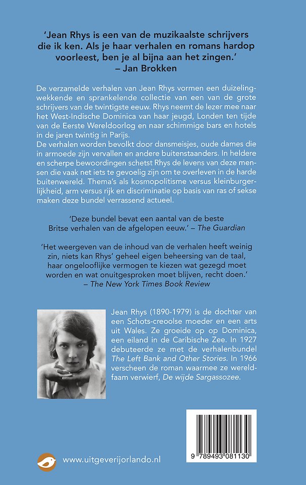 De niet eerder vertaalde verzamelde verhalen van Jean Rhys vormen een duizelingwekkende en sprankelende collectie van een van de grote schrijvers van de twintigste eeuw. Rhys dankt haar faam vooral aan de roman De wijde Sargassozee, maar de verhalen die zij gedurende haar hele leven schreef, laten haar talent pas echt tot zijn recht komen. Rhys neemt de lezer mee naar het West-Indische Dominica van haar jeugd, Londen ten tijde van de Eerste Wereldoorlog en naar schimmige bars en hotels in de jaren twintig in Parijs. Ze worden bevolkt door dansmeisjes, oude dames die in armoede zijn vervallen en andere buitenstaanders. In heldere en scherpe observaties schetst Rhys de levens van mensen die vaak iets te gevoelig