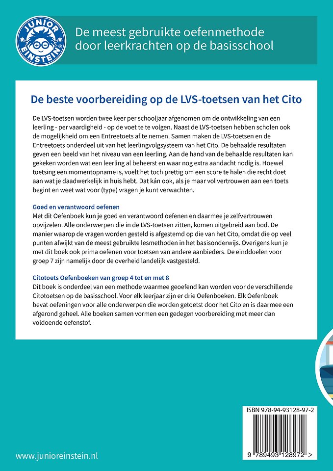 Met dit Oefenboek kun je goed en verantwoord oefenen en daarmee je zelfvertrouwen opvijzelen. Alle onderwerpen die in de LVS-toetsen zitten, komen uitgebreid aan bod. De manier waarop de vragen worden gesteld is afgestemd op die van het Cito, omdat die op veel punten afwijkt van de meest gebruikte lesmethoden in het basisonderwijs. Overigens kun je met dit boek ook prima oefenen voor toetsen van andere aanbieders. De einddoelen voor groep 7 zijn namelijk door de overheid landelijk vastgesteld.