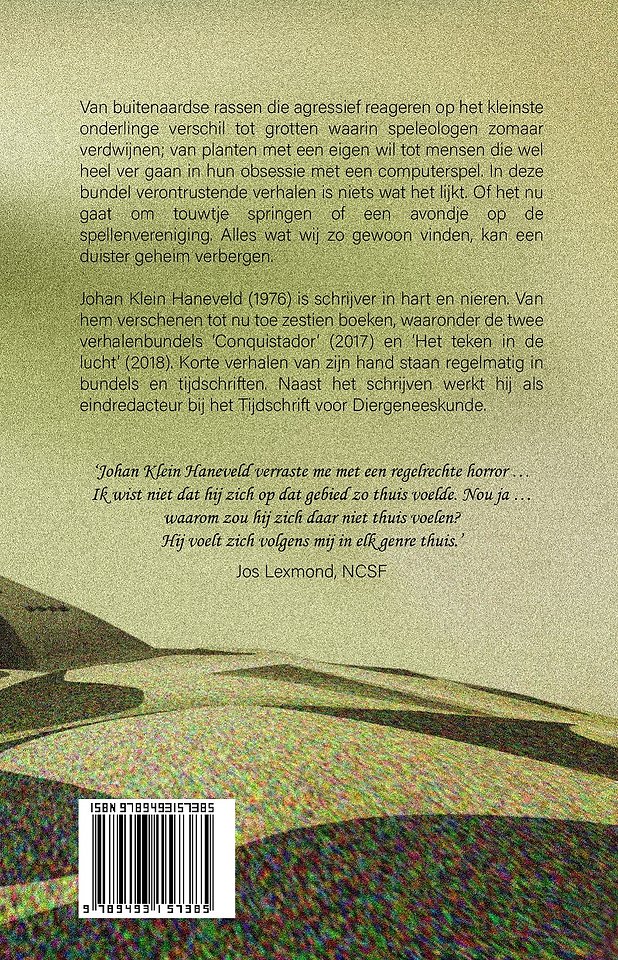 Van buitenaardse rassen die agressief reageren op het kleinste onderlinge verschil tot grotten waarin speleologen zomaar verdwijnen; van planten met een eigen wil tot mensen die wel heel ver gaan in hun obsessie met een computerspel. In deze bundel verontrustende verhalen is niets wat het lijkt. Of het nu gaat om touwtje springen of een avondje op de spellenvereniging. Alles wat wij zo gewoon vinden, kan een duister geheim verbergen.