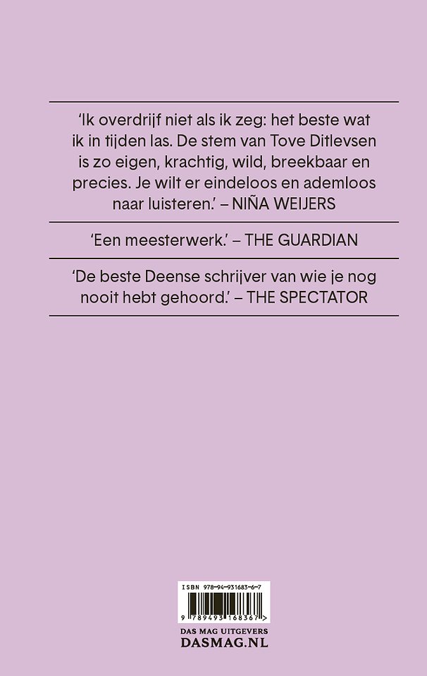 Tove Ditlevsen (1917–1976) werd jarenlang gezien als een schrijver die niet in de literaire kringen van haar tijd paste; ze was een huisvrouw uit de arbeidersklasse met vier gestrande huwelijken en een sluimerende drugsverslaving, waar ze ook nog eens openhartig over schreef. Hoe anders is dat nu: een nieuwe generatie van veelal jonge lezers herontdekt wereldwijd het oeuvre van Tove Ditlevsen. Ze wordt nu gezien als een van de grote literaire sterren van Denemarken. Haar rauwe en springlevende proza krijgt eindelijk de waardering die het verdient.