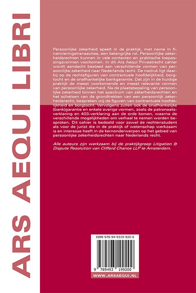 In dit Ars Aequi Privaatrecht cahier wordt aandacht besteed aan verschillende vormen van persoonlijke zekerheid naar Nederlands recht. De nadruk ligt daarbij op de rechtsfiguren van contractuele hoofdelijkheid, borgtocht en de onafhankelijke bankgarantie. Dat zijn in de huidige praktijk de meest voorkomende en meest relevante vormen van persoonlijke zekerheid. Na de plaatsbepaling van persoonlijke zekerheid binnen het spectrum van zekerheidsrechten en het schetsen van de grondtrekken van een persoonlijk zekerheidsrecht, bespreken wij de figuren van contractuele hoofdelijkheid en borgtocht. Vervolgens zullen ook de onafhankelijke (bank)garantie en enkele overige vormen, zoals de patronaatsverklaring en 403-verklaring aan de orde komen, waarna de verschillende mogelijkheden om verhaal te nemen worden besproken.