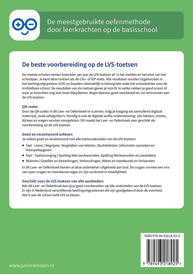Dit Leer- en Oefenboek is full colour, net als de LVS-toetsen. Het boek bevat verschillende soorten teksten, spellingoefeningen en een groot aantal rekenopgaven. Ook in het dagelijks leven komt je kind allerlei soorten teksten tegen, moet het grammaticaal juiste zinnen kunnen schrijven en rekenproblemen kunnen oplossen. Dankzij de afwisselende, leuke en relevante inhoud sluit dit Leer- en Oefenboek goed aan bij de belevingswereld van je kind.