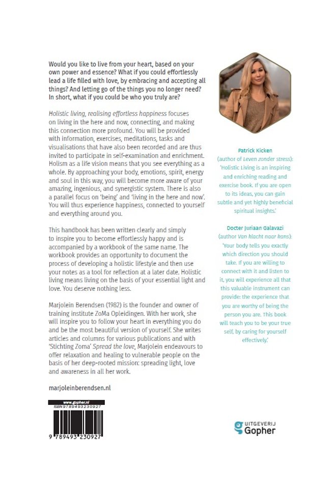 You will thus experience happiness, connected to yourself and everything around you. This handbook has been written clearly and simply to inspire you to become effortlessly happy and is accompanied by a workbook of the same name. The workbook provides an opportunity to document the process of developing a holistic lifestyle and then use your notes as a tool for reflection at a later date. Holistic living means living on the basis of your essential light and