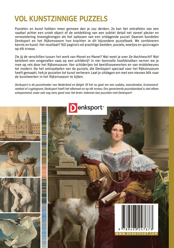 Zie jij de verschillen tussen het werk van Monet en Manet? Wat weet je over De Nachtwacht? Wat betekent een omgevallen vaas op een schilderij? In vier bomvolle hoofdstukken nemen we je mee op reis door het Rijksmuseum. Van schilderijen tot beeldhouwwerken en van middeleeuws tot modern. Na het ontraadselen van de puzzels, die Denksport speciaal voor het Rijksmuseum heeft gemaakt, heb je puzzelen tot kunst verheven. Laat je uitdagen om met een nieuwe blik naar