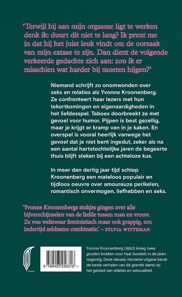 Niemand schrijft zo onomwonden over seks en relaties als Yvonne Kroonenberg. Ze confronteert haar lezers met hun tekortkomingen en eigenaardigheden in het liefdesspel. Taboes doorbreekt ze met gevoel voor humor. Pijpen is best gezellig, maar je krijgt er kramp van in je kaken. En overspel is vooral heerlijk vanwege het gevoel dat je niet bent ingedut, zeker als na een aantal hartstochtelijke jaren de begeerte thuis blijft steken bij een achteloze kus.