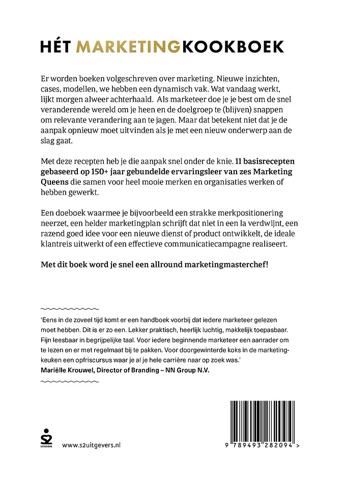 "Eens in de zoveel tijd komt er een handboek voorbij dat iedere marketeer gelezen moet hebben. Dit is er zo een. Lekker praktisch, heerlijk luchtig, makkelijk toepasbaar. Fijn leesbaar in begrijpelijke taal. Voor iedere beginnende marketeer een aanrader om te lezen en er met regelmaat bij te pakken. Voor doorgewinterde koks in de marketingkeuken een opfriscursus waar je al je hele carrière naar op zoek was." - Mariëlle Krouwel, Director of Branding, NN Group N.V.
