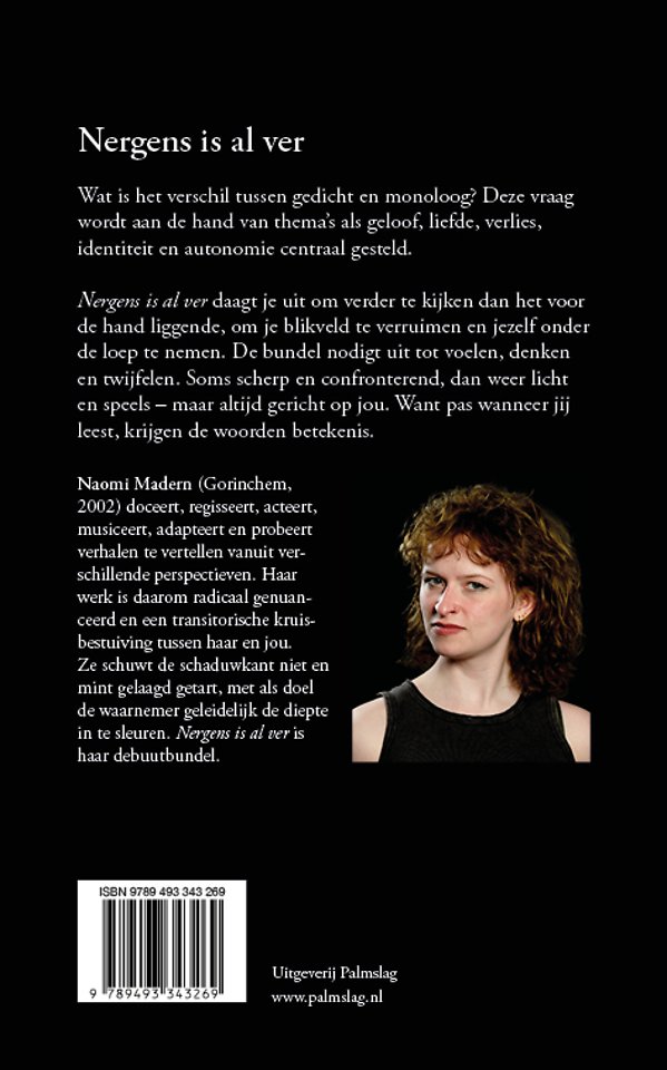 'Nergens is al ver' daagt je uit om verder te kijken dan het voor de hand liggende, om je blikveld te verruimen en jezelf onder de loep te nemen. De bundel nodigt uit tot voelen, denken en twijfelen. Soms scherp en confronterend, dan weer licht en speels – maar altijd gericht op jou. Want pas wanneer jij leest, krijgen de woorden betekenis.