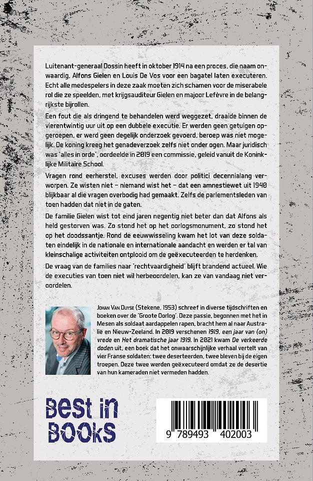 Luitenant-generaal Dossin heeft in oktober 1914 na een proces, die naam onwaardig, Alfons Gielen en Louis De Vos voor een bagatel laten executeren. Echt alle medespelers in deze zaak moeten zich schamen voor de miserabele rol die ze speelden, met krijgsauditeur Gielen en majoor Lefèvre in de belangrijkste bijrollen.