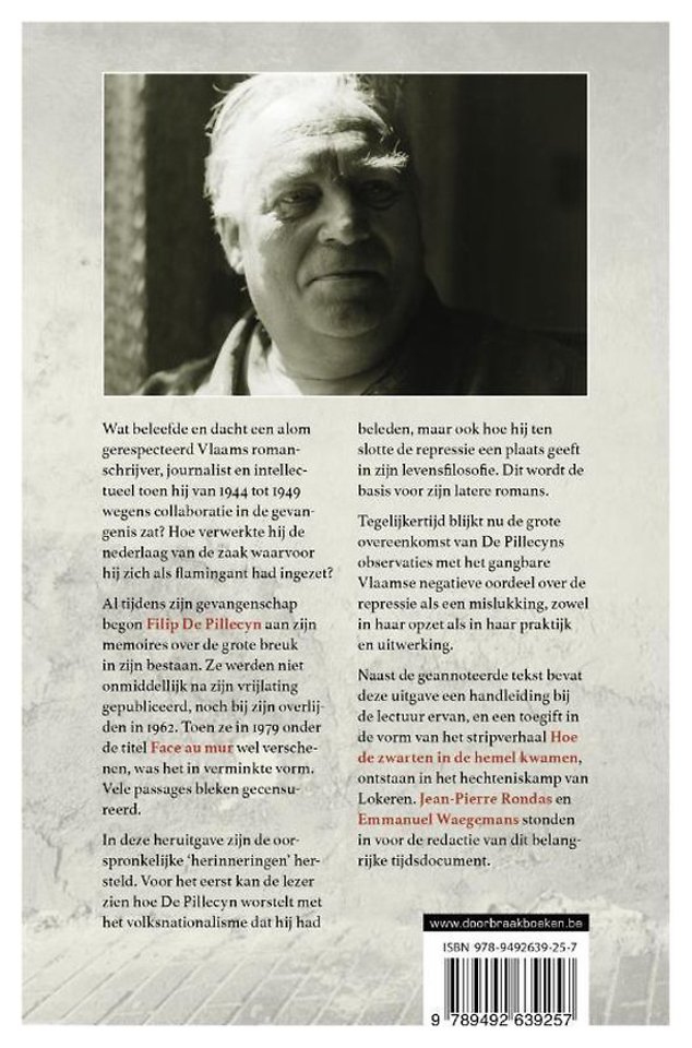 Al tijdens zijn gevangenschap begon Filip De Pillecyn aan zijn memoires over de grote breuk in zijn bestaan. Ze werden niet onmiddellijk na zijn vrijlating gepubliceerd, noch bij zijn overlijden in 1962. Toen ze in 1979 onder de titel Face au mur wel verschenen, was het in verminkte vorm. Vele passages bleken gecensureerd. Doorbraak geeft Tegen de muur vandaag opnieuw uit. In deze heruitgave zijn de oorspronkelijke ‘herinneringen’ hersteld.