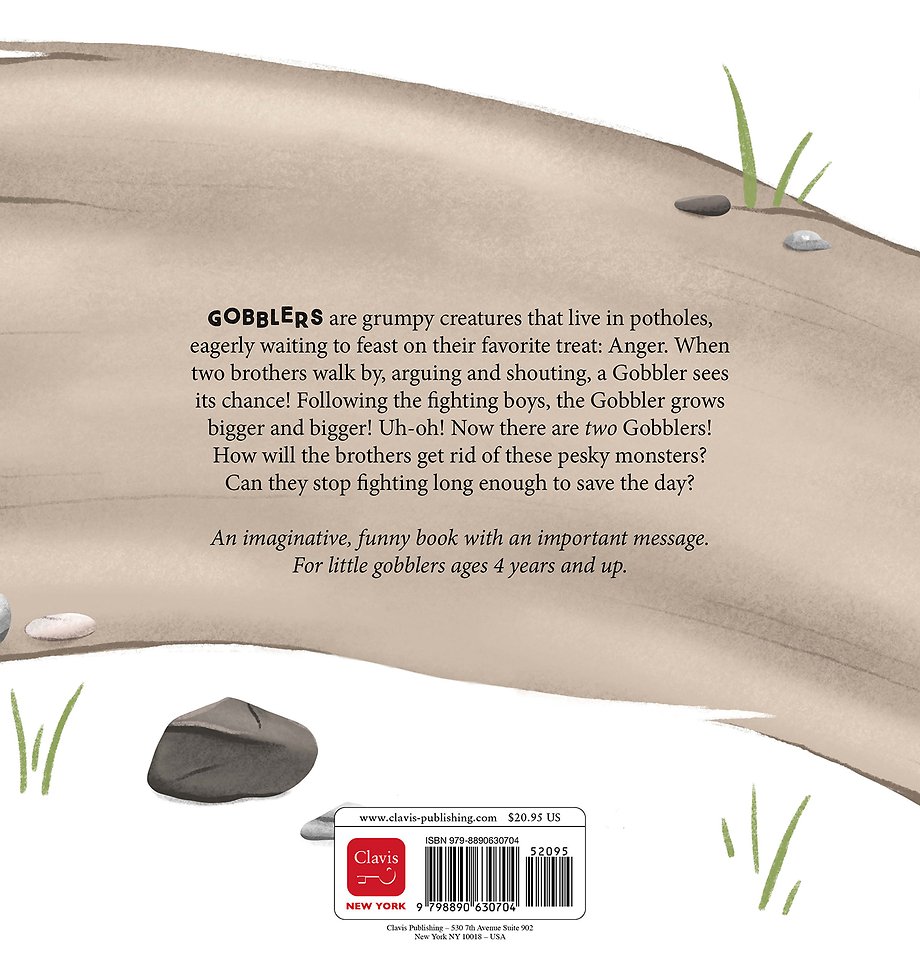 Gobblers are grumpy creatures that live in potholes, eagerly waiting to feast on their favorite treat: Anger. When two brothers walk by, arguing and shouting, a Gobbler sees its chance! Following the fighting boys, the Gobbler grows bigger and bigger! Uh-oh! Now there are TWO Gobblers! How will the brothers get rid of these pesky monsters? Can they stop fighting long enough to save the day?