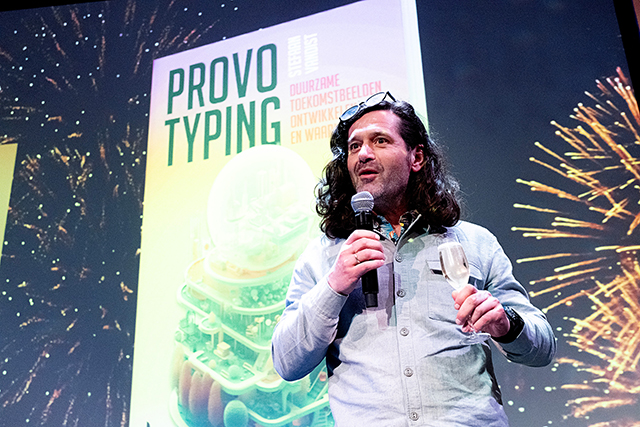 Vandist, een voormalig merkstrateeg die zich als ‘verbeeldingsactivist’ en creatief consultant tegenwoordig richt op duurzaamheidsvraagstukken, was duidelijk verrast met de onderscheiding. ‘Ik heb niets voorbereid’, bekende hij, toen hij met een bos bloemen en de trofee op het podium stond. ‘Ik dacht: de prijswinnaar zal enkele weken geleden al zijn ingelicht, in Nederland is zoiets vast gescript.’ Maar zodra hij over zijn verbazing heen was, nam zijn enthousiasme over zijn missie het als vanzelf over. Hij legde uit hoe de voorganger van Provotyping tot stand was gekomen, Pretopia, het boek dat hij maakte nadat Covid-19 was uitgebroken, en hoe hij dat boek als zijn eigen Coronababy beschouwt. Zijn uitgever, Niels Janssens van LannooCampus, had hem vervolgens gevraagd daar een soort werkboek bij te maken. Dat project werd steeds omvangrijker, ging een eigen leven leiden en resulteerde uiteindelijk in Provotyping, een boek dat gaat over welke toekomsten mogelijk zijn en hoe pioniers over de hele wereld al bezig zijn die vorm te geven. ‘En dat illustreer ik niet aan de hand van de bekende voorbeelden uit Silicon Valley, maar met verhalen over dingen die gebeuren in Oudenaarde, Sao Paulo en Breda, die laten zien hoe je op een zachte manier de toekomst tastbaar kunt maken.’